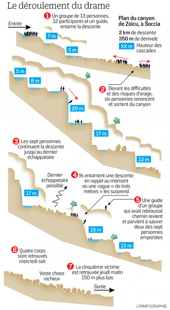 Y a-t-il eu une faute du guide qui encadrait la sortie canyoning ayant viré au drame, mercredi après-midi à Soccia, en Corse-du-Sud ? La question se pose avec acuité après le décès de cinq personnes emportées par une crue soudaine causée par un orage. Un père de 39 ans et sa fille de 7 ans originaires du Nord, un couple de 22 et 26 ans venu de Carcassonne (Aude) et le moniteur lui-même, âgé de 36 ans, ont péri dans le canyon du Zoicu où ils ont été happés par une vague de 3 m.
