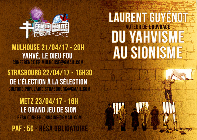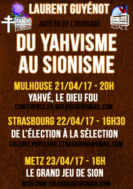 E&R Alsace et E&R Lorraine recevront Laurent Guyénot à Mulhouse, Strasbourg et Metz respectivement les 21, 22 et 23 avril 2017 pour trois conférences distinctes consacrées à son livre Du Yahvisme au sionisme, publié aux éditions Kontre Kulture.