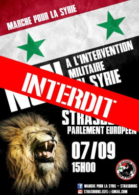 Une manifestation – partant du Parlement européen et allant jusqu’à l’ambassade des États-Unis – était prévue ce samedi 7 septembre à Strasbourg, pour protester contre les velléités de guerre contre la Syrie.
