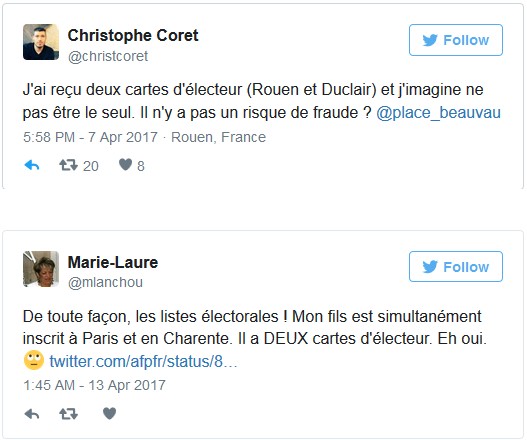En ce week-end pascal, ce n’est pas la multiplication des pains qui inquiète la classe politique mais celle des cartes d’électeurs. Comme l’évoquait notamment Le Monde en fin de semaine, ce dysfonctionnement massif concernerait pas moins de 500 000 électeurs qui auraient reçu deux cartes de vote chacun, à la faveur d’un changement d’adresse. Même si ces doublons ne représentent qu’un peu plus de 1 % des 47 millions d’électeurs français, il y a de quoi fausser, en théorie, le résultat de la présidentielle à venir, mais aussi des législatives du mois de juin. Sur Twitter, ils sont nombreux à assurer avoir reçu deux exemplaires du précieux sésame :
