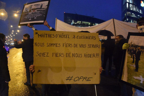 Les maîtres d’hôtels, les extras et cuisiniers de la restauration « dénoncent la détresse et la disparition de toute une profession (restauration événementielle) et demandent de l’aide au gouvernement », selon le journaliste de RT France sur place.