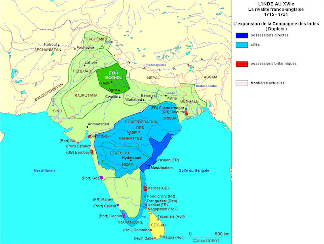 Depuis la création par Jean-Baptiste Colbert de la Compagnie des Indes orientales en 1664, la France était devenue l’acteur européen dominant du sous-continent Indien au milieu du XVIIIe siècle. Grâce à deux grands héros français, Joseph François Duplex, gouverneur des établissements français de l’Inde, et son second, Charles Joseph Patissier de Bussy, marquis de Castelnau, la France y atteint l’apogée de son influence avant la guerre de Sept Ans.