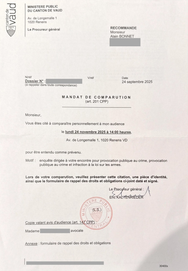 En effet, suite à une seconde garde à vue subie en mai 2025 – après avoir été interpellé par les forces de l’ordre suisses et perquisitionné à son domicile lausannois – notre président est sous le coup d’une enquête pour provocation publique au crime (crime de lèse-majesté ?)